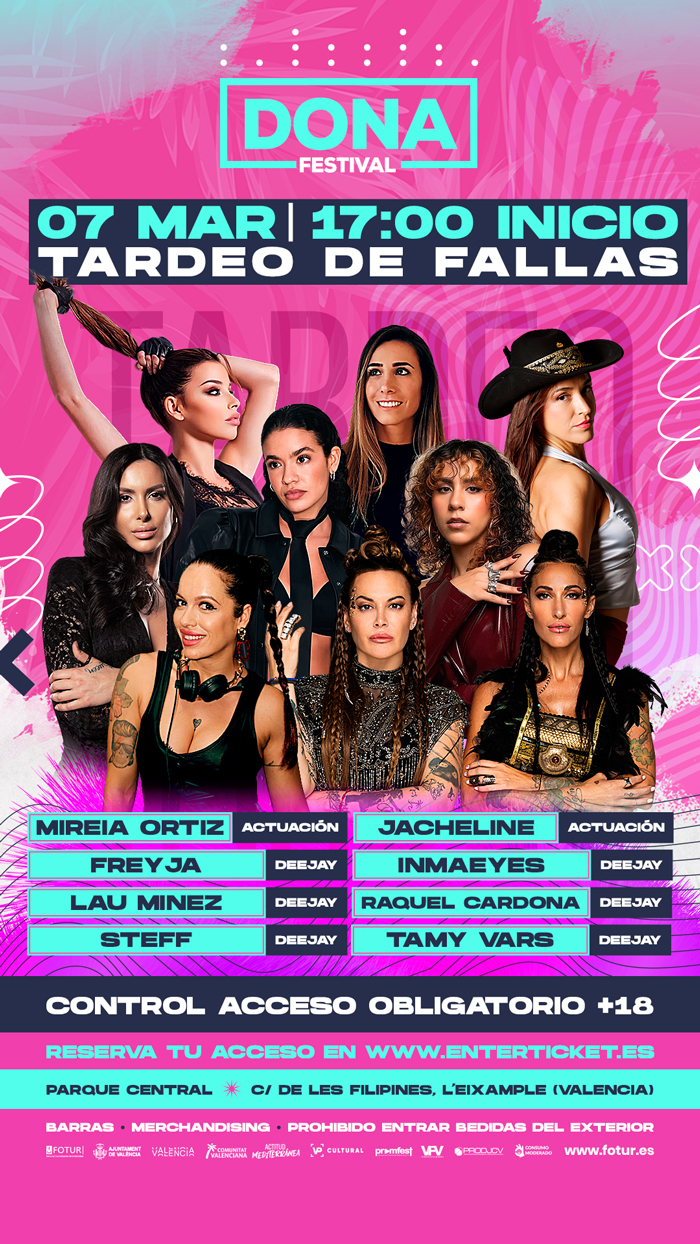 Dona Festival es un evento musical pionero en España, caracterizado por ser el primer festival de gran formato con un cartel compuesto íntegramente por mujeres artistas, cantantes y DJs. El evento nace con el propósito firme de dar visibilidad al talento femenino en la industria musical, promoviendo la igualdad de oportunidades sobre el escenario. 8 Años de Historia: Del Puerto de Valencia al Parque Central.