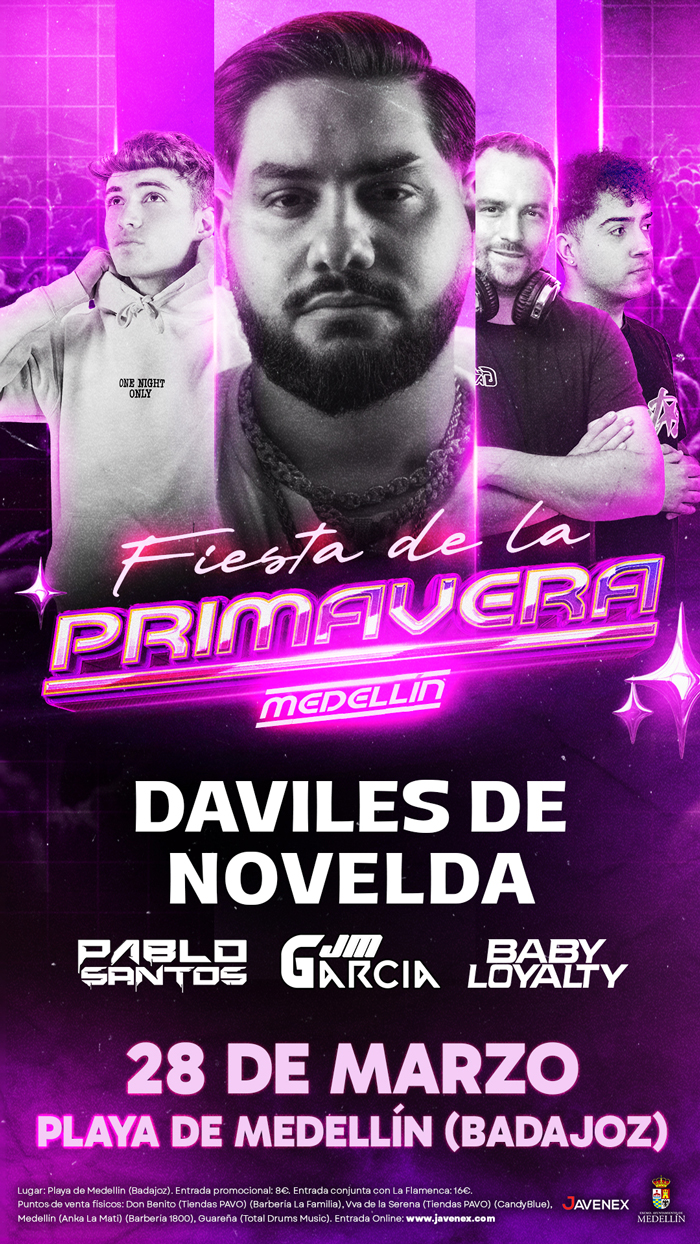 Medellín celebrará la quinta edición de la Fiesta de la Primavera que cada año congrega a más de 1500 personas. Tras el paso de grandes artistas como Galván Real, Bandaga, La Húngara y Canelita; esta edición contará con uno de los artistas de más renombre del panorama nacional como es Daviles De Novelda. Además, contaremos con los dj’s más conocidos de la zona que harán que bailemos durante más de 8 horas.