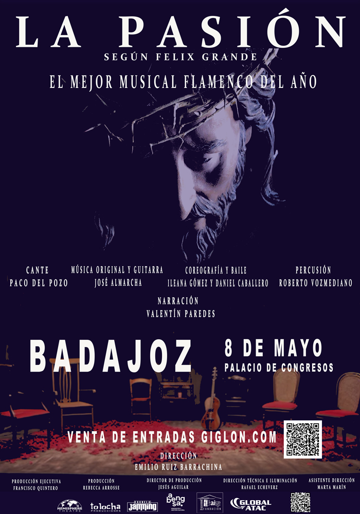 Impresionante musical flamenco escrito por el poeta y flamencólogo extremeño Félix Grande, que cuenta las últimas horas de vida de Jesús. Al cante está Paco del Pozo, ganador de la Lámpara Minera del Festival de la Minas de La Unión y a la guitarra, José Almarcha, uno de los más importates guitarristas de la actulaidad. La coreografía ha sido diseñada por los bailaores Daniel Caballero e Ileana Gómez. Una cita imprescindible que emociona, cautiva y sorprende.